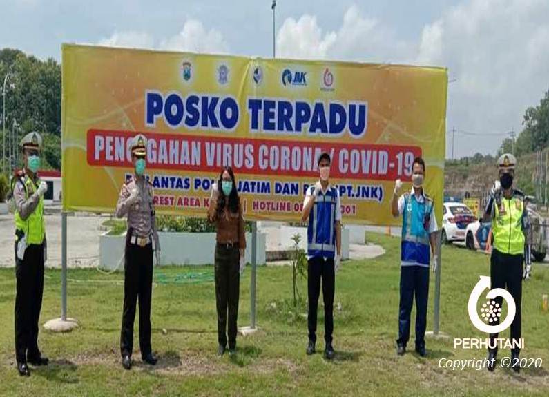 SARADAN, PERHUTANI (01/04/2020) | Untuk mengantisipasi dan mencegah penularan Corona Virus Disease (Covid -19), Perhutani Kesatuan Pemangkuan Hutan (KPH) Saradan mendirikan Posko Terpadu bekerjasama dengan PT Jasa Marga Ngawi Kertosono (JNK) dan Satuan Lalu Lintas (Satlantas) Kepolisian Daerah (Polda) Jawa Timur di Rest Area Km 626 Saradan, Rabu (01/04).