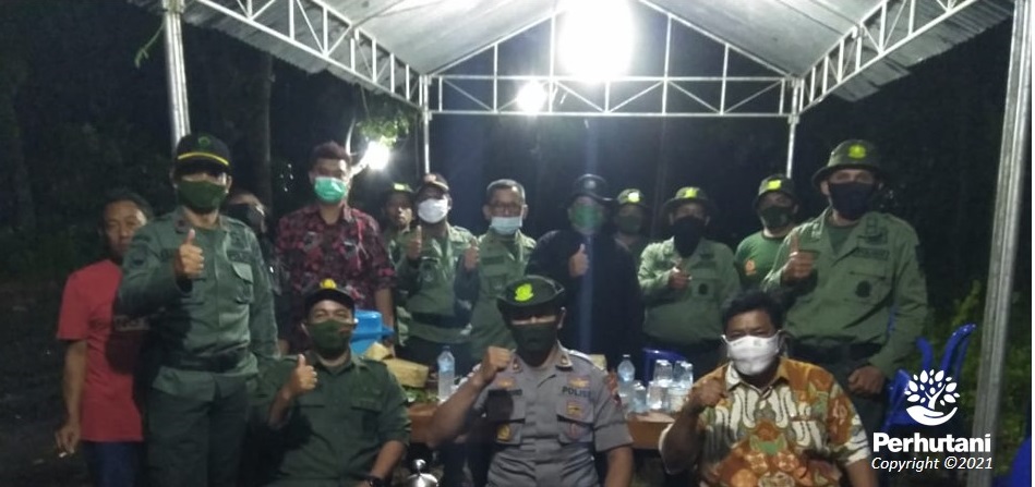 KEDU SELATAN, PERHUTANI (28/02/2021) | Dalam rangka menekan gangguan keamanan hutan (gukamhut) dan kesiapsiagaan penanggulangan bencana alam, jajaran Polisi Hutan (Polhut) serta Pabin Jagawana Kesatuan Pemangkuan Hutan (KPH) Kedu Selatan bersama Kepala Desa Nampurejo, Kecamatan Purwodadi melaksanakan apel gukamhut sekaligus patroli malam dan sosialisasi kemasyarakatan di Resort Pemangkuan Hutan (RPH) Loano, Bagian Kesatuan Pemangkuan Hutan (BKPH) Purworejo, Sabtu (27/02).