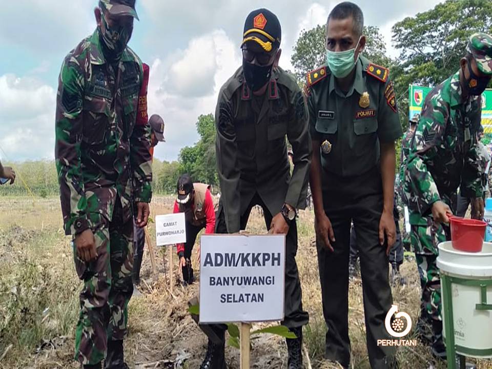 BANYUWANGI SELATAN, PERHUTANI (24/10/2020) | Perhutani Kesatuan Pemangkuan Hutan (KPH) Banyuwangi Selatan bekerjasama dengan Forum Komonikasi Pimpinan Kecamatan (Forkopimka) Purwoharjo dan Lembaga Masyarakat Desa Hutan (LMDH) Hutan Lestari desa Karetan melakukan penanaman perdana tanaman tahun 2020 bertempat di petak 68d dengan luas 5,2 ha, Jumat (23/10)