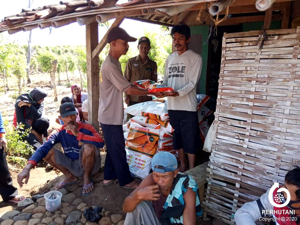 MADIUN, PERHUTANI (8/10/2020) | Perhutani Kesatuan Pemangkuan Hutan (KPH) Madiun bersama LMDH Wono Seto Desa Jimbe Kecamatan Jenangan Kabupaten Ponorogo bersinergi menyalurkan sebanyak 870 kilogram benih jagung hibrida bisi 18 kepada 176 petani hutan penggarap lahan dibawah tegakan tanaman kayu putih seluas 58 hektar di Ponorogo, Kamis (8/10).