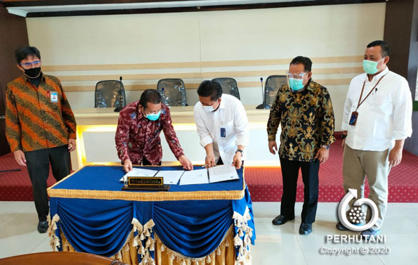 MALANG, PERHUTANI (28/8/2020) | Direktur Utama (Dirut) Perhutani Wahyu Kuncoro dan Rektor Universitas Brawijaya (UB) Malang Nuhfil Hanani menandatangani Memorandum of Understanding (MoU) tentang pengembangan pelaksanaan tri dharma perguruan tinggi bidang Kehutanan pemanfaatan Kawasan Hutan Dengan Tujuan Khusus (KHDTK) yang berlangsung di gedung Rektorat Civitas Akademika UB Malang, Kamis (27/8).