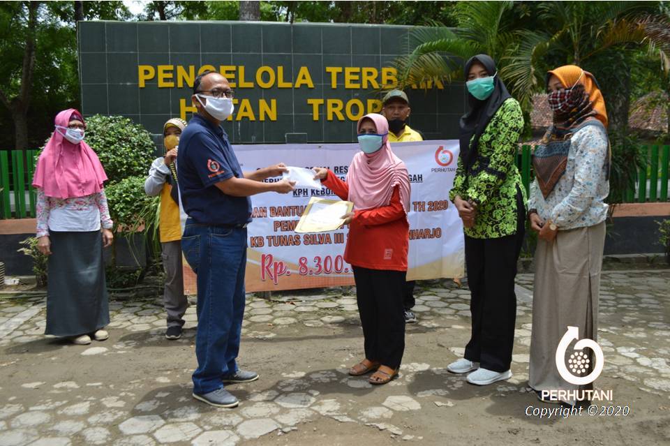 KEBONHARJO, PERHUTANI (09/10/2020) | Perhutani Kesatuan Pemangkuan Hutan (KPH) Kebonharjo menyerahkan bantuan program Bina Lingkungan (BL) sebesar Rp 8,3 juta rupiah kepada Kelompok Belajar Tunas Silva III Kebonharjo, Kecamatan Jatirogo, Tuban di Kantor KPH Kebonharjo, Jumat (09/10).