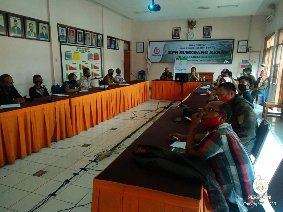SUMEDANG, PERHUTANI (16/06/2020) | Perhutani Kesatuan Pemangkuan Hutan (KPH) Sumedang melaksanakan sosialisasi protokol Kesehatan New Normal di lokasi wisata kepada seluruh Mitra Kerja Perhutani Sumedang, bertempat di Aula Kantor KPH Sumedang, Selasa (16/06).