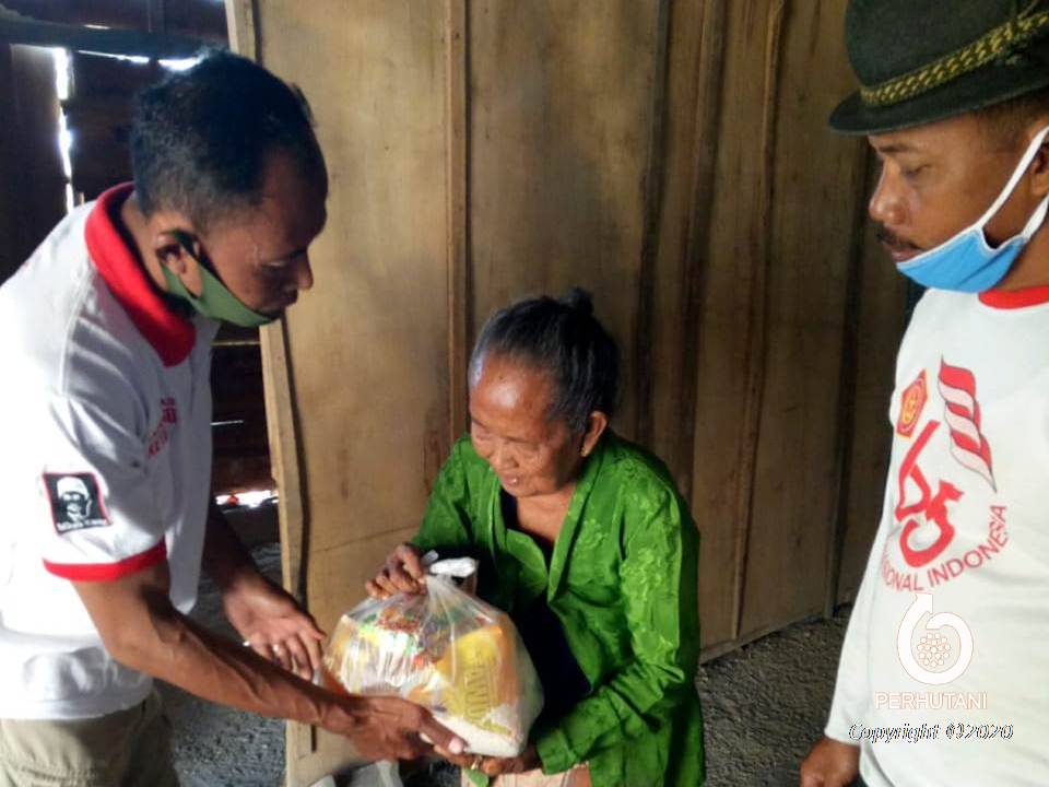 NGAWI, PERHUTANI (26/9/2020) | Serikat Karyawan (Sekar) Perhutani Dewan Pimpinan Daerah (DPD) Ngawi membagikan puluhan paket sembako berisi beras, mie instan, kecap, minyak goreng dan gula kepada masyarakat sekitar hutan di wilayah Resort Pemangkuan Hutan (RPH) Ngandong, Bagian Kesatuan Pemangkuan Hutan (BKPH) Ngandong yang secara Administratif wilayah tersebut masuk Kabupaten Blora, pada Jumat (25/9).