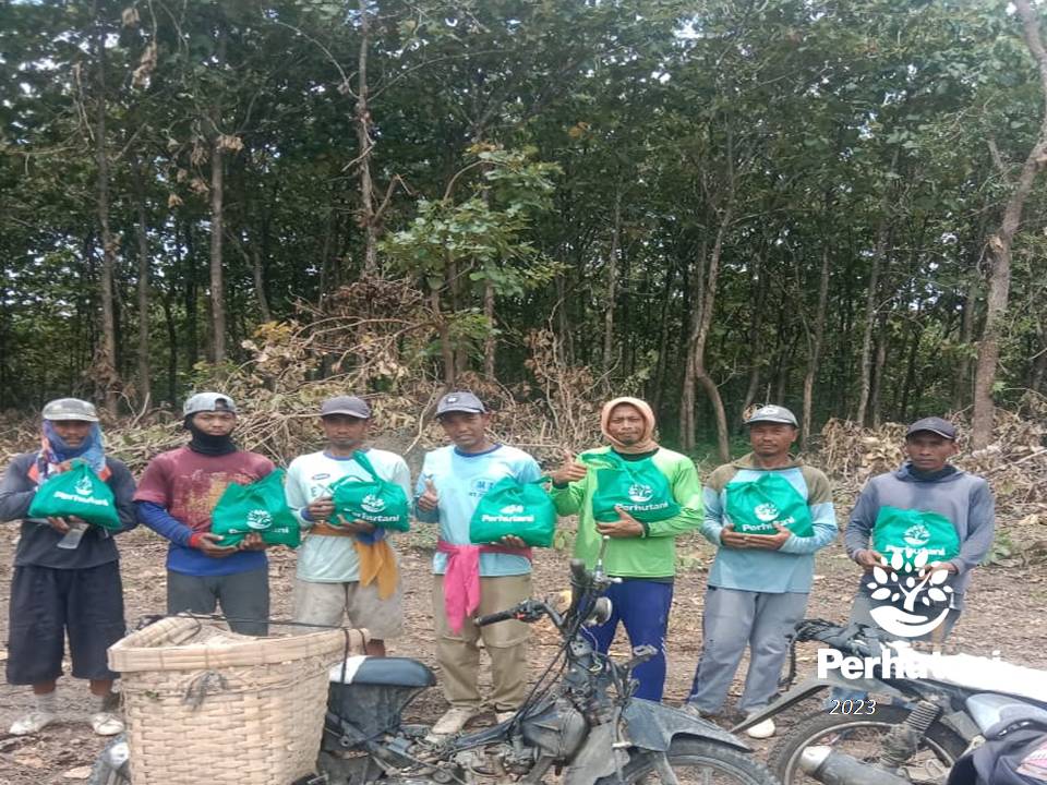 BLORA, PERHUTANI (15/04/2023) | Perum Perhutani Kesatuan Pemangkuan Hutan (KPH) Blora membagikan bingkisan paket sembako lebaran yang berisi beras, gula, teh, minyak goreng dan kue kepada mitra kerja Perhutani sebanyak 145 paket yaitu tenaga produksi kayu, tenaga angkut di Tempat Penimbunan Kayu (TPK) dan tenaga persemaian yang bekerja di wilayah Perhutani KPH Blora, Sabtu (15/04).