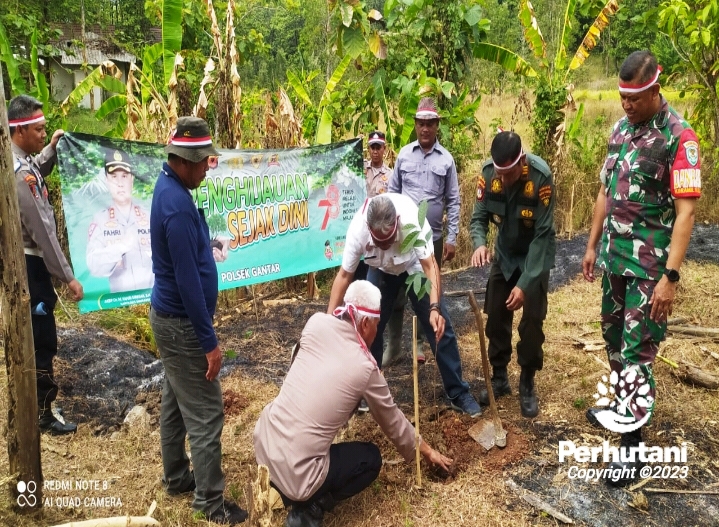 INDRAMAYU, PERHUTANI (23/8/2023) | Perhutani Kesatuan Pemangkuan Hutan (KPH) Indramayu bersama Jajaran Polsek Gantar, Polres Indramayu turut serta dalam kegiatan penanaman pohon secara serentak dengan tema “Polri Lestarikan Negeri, Penghijauan Sejak Dini.” Bertempat di Lokasi Wisata Puncak Tugu Sanca, Bagian Kesatuan Pemangkuan Hutan (BKPH) Sanca, masuk wilayah administratif Desa Sanca, Kecamatan Gantar, Kabupaten Indramayu. Rabu (23/8)
