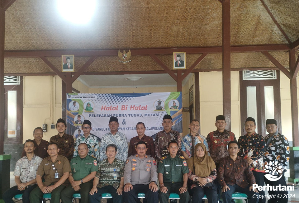 BALAPULANG, PERHUTANI (30/04/2024) | Perhutani Kesatuan Pemangkuan Hutan (KPH) Balapulang menghadiri halalbihalal sekaligus pelepasan purna tugas dan mutasi di tingkat Pemerintah Kecamatan Balapulang yang dihadiri oleh Camat Balapulang, Kepala Kepolisian Sektor (Kapolsek) Balapulang, Komando Rayon Militer (Danramil) 17 Balapulang, Kepala Puskesmas, dan seluruh Unit Pelaksana Teknis Dinas (UPTD) dalam wilayah Kecamatan Balapulang di pendopo Eks Kawedanan Balapulang atau Kantor Kecamatan, Selasa (30/04).