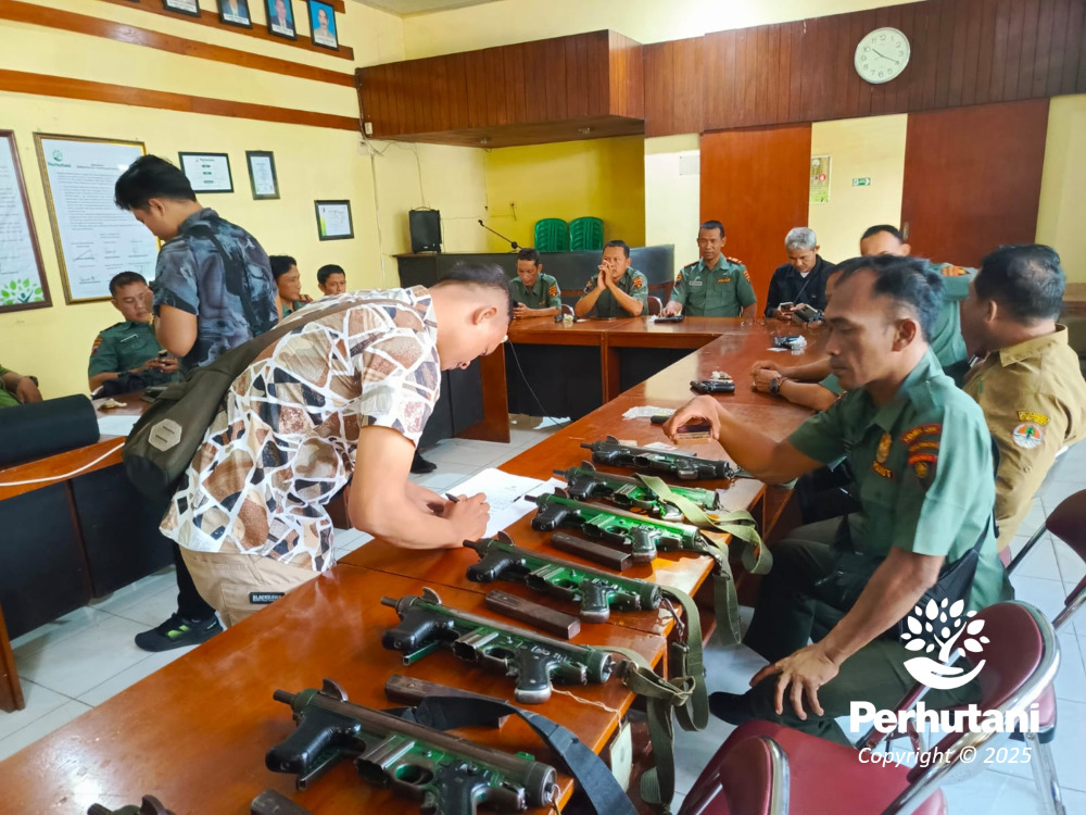MANTINGAN, PERHUTANI (25/03/2025) | Perum Perhutani Kesatuan Pemangkuan Hutan (KPH) Mantingan bersama dengan Tim Satuan Intelijen dan Keamanan (Satintelkam) Kepolisian Resor (Polres) Rembang melaksanakan pemeriksaan senjata api (senpi) yang dipegang oleh jajaran keamanan Polisi Hutan KPH Mantingan di ruang rapat KPH Mantingan, Selasa (25/03).