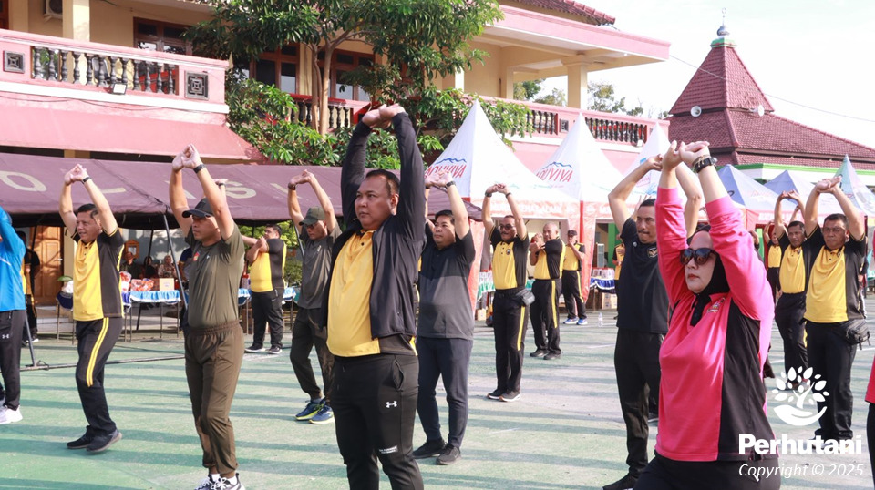 RANDUBLATUNG, PERHUTANI (26/06/2025) | Perum Perhutani Kesatuan Pemangkuan Hutan (KPH) Randublatung turut berpartisipasi dalam rangkaian kegiatan Semarak Hari Ulang Tahun (HUT) ke-79 Bhayangkara yang digelar Polres Blora di halaman Markas Polres Blora, Kamis (26/06). Kegiatan ini dilaksanakan dalam bentuk olahraga bersama dan diikuti oleh jajaran Forkopimda Blora, Purnawirawan Polri, TNI dari Kodim 0721/Blora, serta instansi terkait lainnya, termasuk Perum Perhutani Blora Raya.