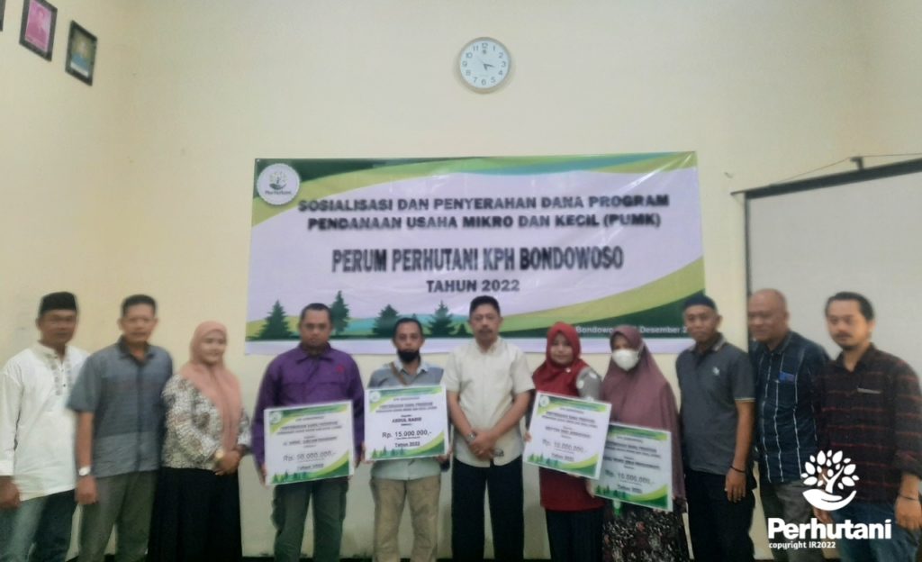 BONDOWOSO, PERHUTANI (16/12/2022) | Perum Perhutani Kesatuan Pemangkuan Hutan (KPH) Bondowoso menyalurkan bantuan dana program Pendanaan Usaha Mikro dan Kecil (PUMK) tahun buku 2022 dengan suku bunga rendah 6% senilai Rp. 85 juta secara simbolis, kepada sejumlah pelaku Usaha Mikro Kecil Menengah (UMKM). Pinjaman modal usaha tersebut, guna membantu usaha permodalan serta meningkatkan kondisi perekonomian masyarakat, Bondowoso, Jumat (16/12).
