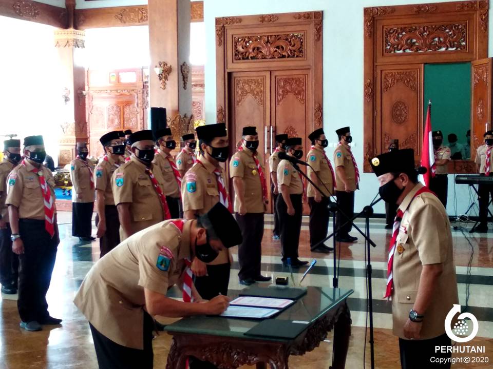 MADIUN, PERHUTANI (09/10/2020) | Administratur Perhutani Kesatuan Pemangkuan Hutan (KPH) Madiun Wakhid Nurdin dilantik sebagai anggota Majelis Pembimbing Pramuka Kwartir Cabang (Kwarcab) Kabupaten Madiun bersama dengan pelantikan Pengurus Kwarcab lainnya di Pendopo Ronggo Djumeno Kabupaten Madiun, Rabu (7/9)