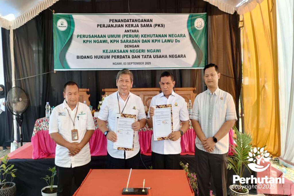 SARADAN, PERHUTANI (03/09/2025) | Perhutani Kesatuan Pemangkuan Hutan (KPH) Saradan menandatangani Perjanjian Kerjasama (PKS) dengan Kejaksaan Negeri Ngawi yang bertujuan untuk mengamankan aset negara berupa hutan yang dilaksanakan di di petak 92E Resort Pemangkuan Hutan (RPH) Biren, BKPH Kedawak Utara,KPH Saradan, pada Rabu (03/09).