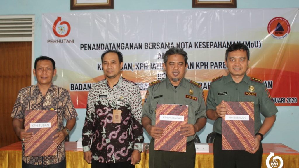 TUBAN, PERHUTANI (25/01/2020) | Untuk persiapan dini penanggulangan bencana alam Perum Perhutani Kesatuan Pemangkuan Hutan (KPH) Tuban melakukan kerjasama tentang siaga bencana alam yang ditandai dengan penandatanganan naskah kesepahaman atau Memorandum of Undersatanding (MoU) dengan Badan Penanggulangan Bencana Daerah (BPBD) Kabupaten Tuban, pada Kamis (23/10).