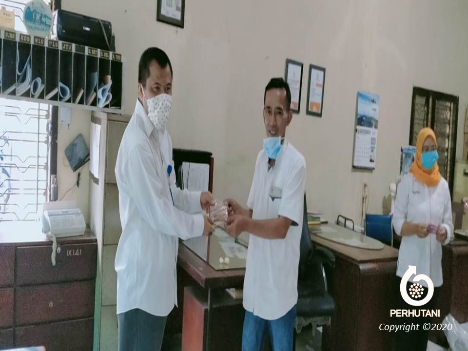 Administratur KPH Saradan, Noor Rochman secara simbolis menyerahkan masker kepada Mandor Tebang BKPH Kedungbrubus, Budiono disaksikan Assisten Perhutani (Asper) BKPH, Kedungbrubus Purwanto dilanjutkan dengan memberikan pengarahan tentang cara pencegahan Covid-19 dengan menggunakan masker dan saran perilaku hidup sehat dengan selalu mencuci tangan dengan sabun juga menjaga jarak dengan orang lain (Phicycal Distancing).