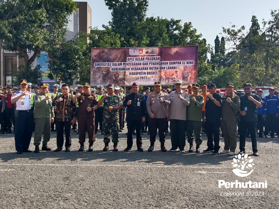 PEKALONGAN BARAT, PERHUTANI (24/08/2023) | Perhutani Kesatuan Pemangkuan Hutan (KPH) Pekalongan Barat dan KPH Balapulang bersama Pemerintah Kabupaten (Pemkab) Brebes serta stakeholder pihak-pihak terkait seperti Tentara Nasional Indonesia (TNI) – Kepolisian Republik Indonesia (Polri) melaksanakan apel kesiapsiagaan menghadapi dampak fenomena El-Nino seperti kebakaran hutan dan lahan (karhutla) dan kekeringan tahun 2023 di lapangan Islamic Center Kabupaten Brebes, Kamis (24/08).