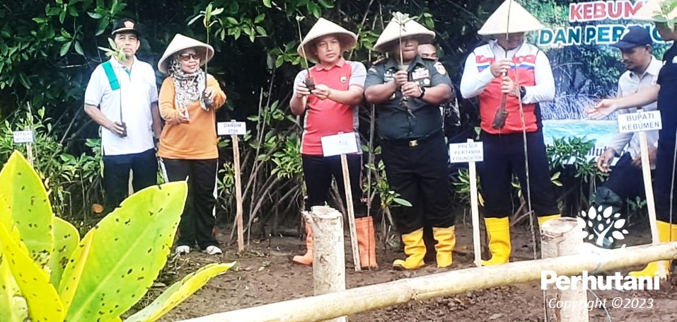 KEDU SELATAN, PERHUTANI (21/06/2023) | Perhutani Kesatuan Pemangkuan Hutan (KPH) Kedu Selatan bersama Bupati Kebumen, PT Pertamina, dan Forum Komunikasi Pemerintah Daerah (Forkompinda) Kabupaten Kebumen melakukan penanaman mangrove di Kebumen, Selasa (20/06).