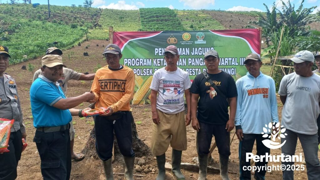BANYUWANGI BARAT, PERHUTANI (05/09/2025) | Perhutani Kesatuan Pemangkuan Hutan (KPH) Banyuwangi Barat bersama Kepolisian Sektor (Polsek) Sempu dan Kelompok Tani Hutan (KTH) Flamboyan melaksanakan kegiatan penanaman jagung hibrida merek Betras 2 di petak 62m-1 Resort Pemangkuan Hutan (RPH) Purwodadi, Bagian Kesatuan Pemangkuan Hutan (BKPH) Kalisetail pada Jumat (5/9).