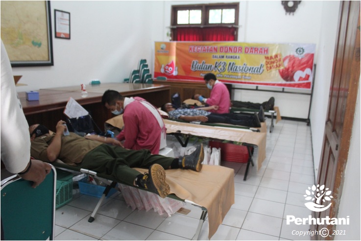 PEKALONGAN TIMUR, PERHUTANI (12/02/2021) | Guna mendukung Palang Merah Indonesia (PMI) dalam memenuhi stok darah, Perhutani Kesatuan Pemangkuan Hutan (KPH) Pekalongan Timur menggelar kegiatan Donor Darah pada Bulan K3 Nasional Tahun 2021 di Kantor KPH Pekalongan Timur, Kamis (11/02).