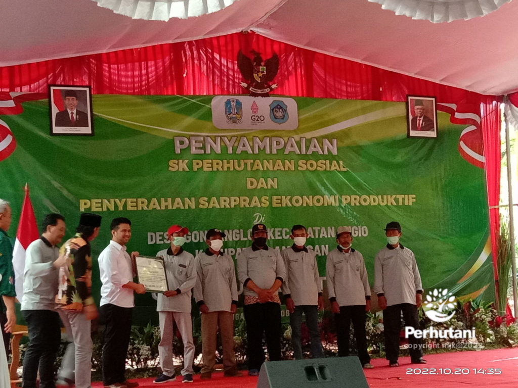 MOJOKERTO, PERHUTANI (20/10/2022) | Dalam rangka mendukung Program pemerintah, Perhutani Kesatuan Pemangkuan Hutan (KPH) Mojokerto turut serta menghadiri penyerahan Surat Keputusan (SK) Hutan Sosial yang dilakukan di Wana Wisata Rintisan Gondang Park di Resort Pemangkuan Hutan (RPH) Gondanglor, Bagian Kesatuan Pemangkuan Hutan (BKPH) Lawangan Agung, Kamis (20/10).