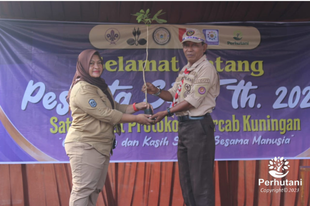 KUNINGAN, PERHUTANI (13/11/2023) | Perum Perhutani Kesatuan Pemangkuan Hutan (KPH) Kuningan mendukung kegiatan Scouting For Others dengan memberikan bantuan bibit tanaman 150 (seratur lima puluh) plances kepada Kwartir Cabang (Kwarcab) Kabupaten Kuningan, bertempat di Perum Perhutani KPH Kuningan, pada Minggu (12/11).