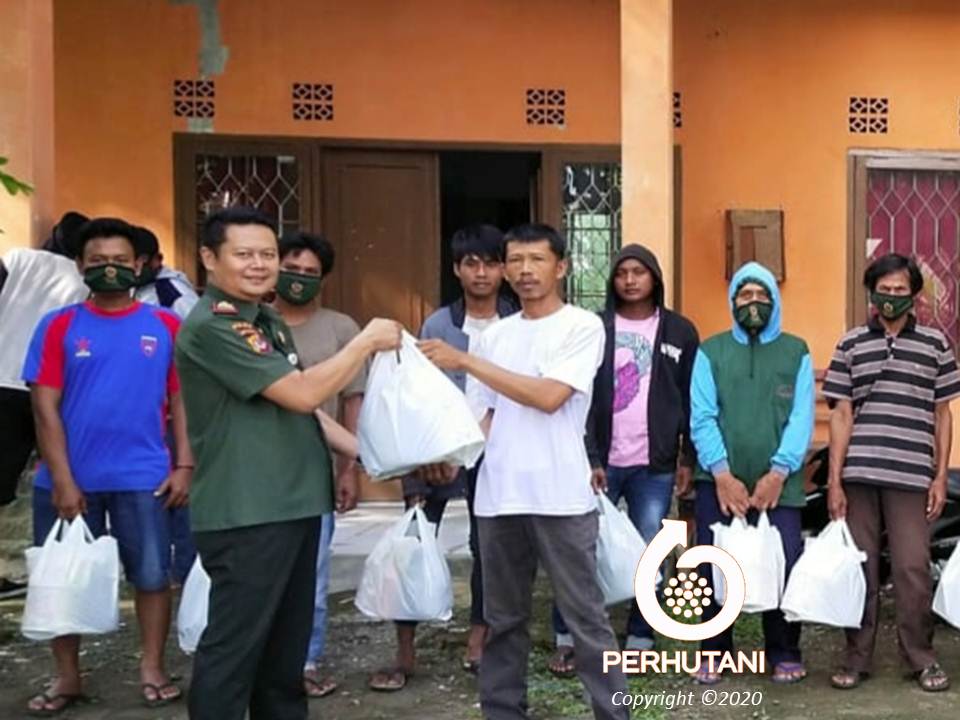 KUNINGAN, PERHUTANI (23/05/2020) | Perhutani Kesatuan Pemangkuan Hutan (KPH) Kuningan memberikan bingkisan sembako kepada para pekerja blandong tebangan dan pungut daun kayu putih berupa beras, gula, minyak goreng dan lainnya bertempat di halaman Kantor Bagian Kesatuan Pemangkuan Hutan (BKPH) Waled, Jum’at (22/05).