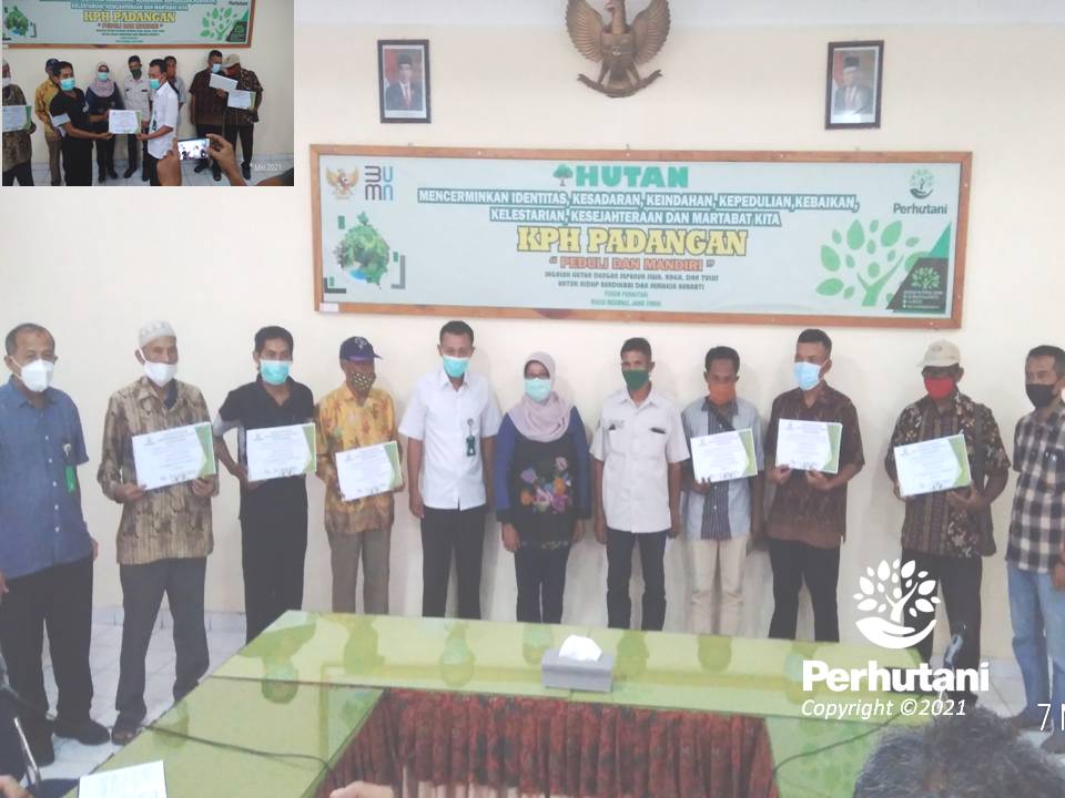 PADANGAN, PERHUTANI (7/5/2021) | Perhutani Kesatuan Pemangkuan Hutan (KPH) Padangan menyerahkan biaya pengamanan kerjasama agroforestry tanaman tebu sebesar Rp 182 juta lebih kepada Lembaga Masyarakat Desa Hutan (LMDH) wilayah Bagian Kesatuan Pemangkuan Hutan (BKPH) Tobo, Tegaron dan BKPH Kaliaren Barat bertempat di ruang rapat Kantor KPH Padangan, Jumat (7/5).