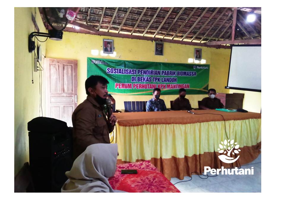 MANTINGAN, PERHUTANI (13/04/2022) | Perhutani Kesatuan Pemangkuan Hutan (KPH) Mantingan melakukan sosialisasi rencana pendirian pabrik biomassa di Balai Desa Landoh Kecamatan Sulang Kabupaten Rembang yang dikawal oleh Lembaga Swadaya Masyarakat (LSM) Kalal dan LSM Aliansi Tajam, Selasa (12/04).