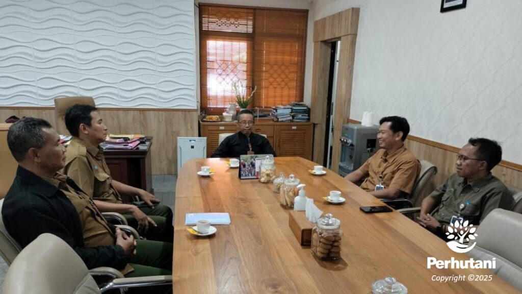 BANYUWANGI, PERHUTANI (14/10/2025) | Dalam rangka memperkuat sinergi, kolaborasi, dan membuka peluang kerja sama pengelolaan wisata di kawasan hutan, Perhutani Kesatuan Pemangkuan Hutan (KPH) Banyuwangi Selatan bersama PT Palawi Risorsis melakukan kunjungan sinergitas ke Pemerintah Kabupaten (Pemkab) Banyuwangi, yang diterima langsung oleh Sekretaris Daerah (Sekda) Banyuwangi, Guntur Priambodo, di ruang kerjanya, Selasa (14/10).