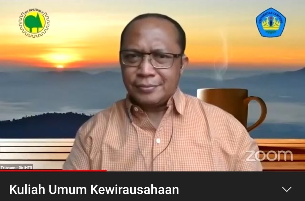 LAMPUNG, INHUTANI V (21/06/2021) | Direktur Inhutani V Trianom Wahyudi menyampaikan kuliah umum kewirausahaan kehutanan secara online kepada 130 orang mahasiswa dan dosen Jurusan Kehutanan Fakultas Pertanian Universitas Lampung (UNILA) pada 19 Juni 2021.