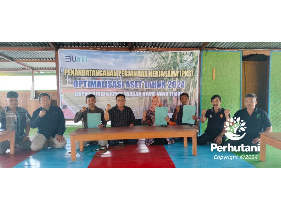 SARADAN, PERHUTANI (07/01/2024) | Guna lebih meningkatkan pendapatan perusahaan di awal tahun 2024, Perhutani Kesatuan Pemangkuan Hutan (KPH) Saradan melakukan upaya peningkatan pemanfaatan tanah Djawatan Kehutanan (DK) Perhutani dilingkungan wilayah kerja Perhutani Saradan, hal itu ditandai dengan dilakukannya penandatanganan Perjanjian Kerjasama (PKS) pemanfaatan tanah DK Perhutani antara para pemohon dengan Perhutani yang dilaksanakan di Warung Apung Wisata Waduk Pondok Ngawi pada Minggu, (07/01)