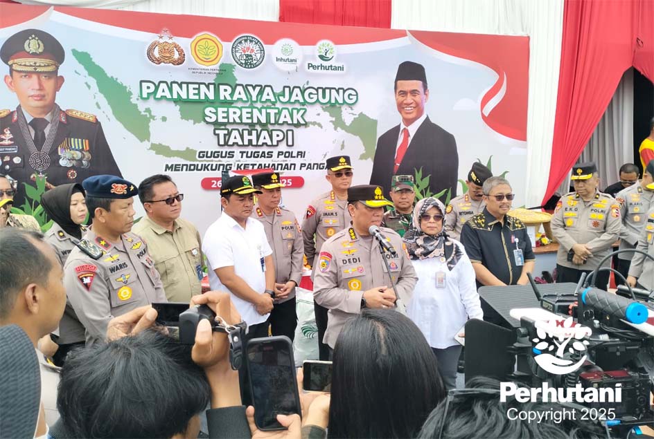 SURABAYA, PERHUTANI (26/02/2025) | Inspektur Pengawasan Umum (Irwasum) Polri Komjen Pol. Dedi Prasetyo pimpin acara panen raya jagung di Kawasan hutan Perhutani Kesatuan Pemangkuan Hutan (KPH) Saradan, di Desa Bulu , Kecamatan Pilangkenceng Kabupaten Madiun, Rabu (26/02).