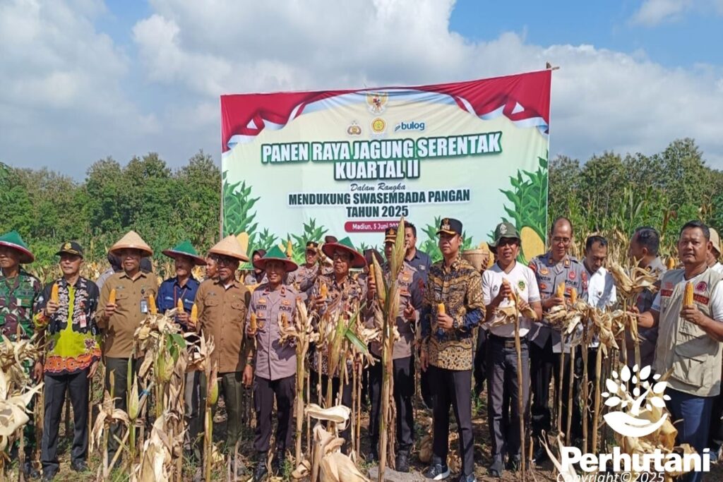 SARADAN, PERHUTANI (05/06/2025) | Dalam rangka mewujudkan program asta cita Pemerintah, Kesatuan Pemangkuan Hutan (KPH) Saradan menggelar kegiatan Panen Raya Jagung Quartal II sebagai bentuk kolaborasi nyata bersama berbagai stakeholder dalam mendukung program ketahanan pangan nasional. Acara ini dilaksanakan di wilayah hutan produksi petak 155-C RPH Pajaran BKPH Pajaran  KPH Saradan dan dihadiri langsung oleh Bupati Madiun, Forkopimda, petani hutan binaan, serta sejumlah mitra kehutanan pada Kamis (05/06/2025).