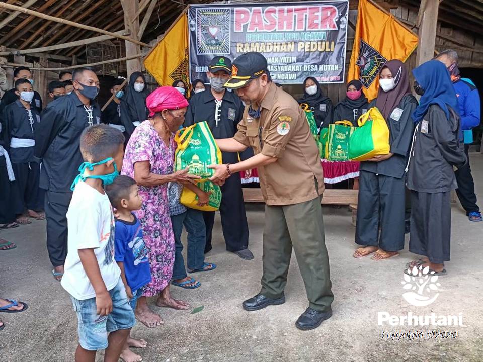 NGAWI, PERHUTANI (11/5/2021) | Puluhan paket sembako berisi beras, minyak goreng, mie instan dan bahan makanan lainnya dibagikan oleh anggota PASHTER Perhutani Kesatuan Pemangkuan Hutan (KPH) Ngawi kepada anak-anak yatim piatu dan dhu’afa yang tinggal di sekitar kawasan hutan Ngawi yang dilaksanakan secara serentak di tiga Bagian Kesatuan Pemangkuan Hutan (BKPH) yaitu BKPH Kedawak Selatan, BKPH Sonde dan BKPH Payak, pada Senin (10/5).