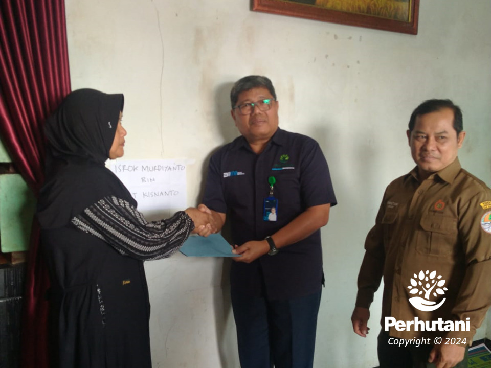 Penyerahan santunan diberikan langsung oleh Administratur KPH Pekalongan Timur didampingi Plt. Wakil Administratur KPH Pekalongan Timur, Misnun, kepada kerabat Almarhum atas nama Endang Trisnowati Isro Murdiyanto, yang disaksikan oleh perwakilan Kepala BKPH terkait.