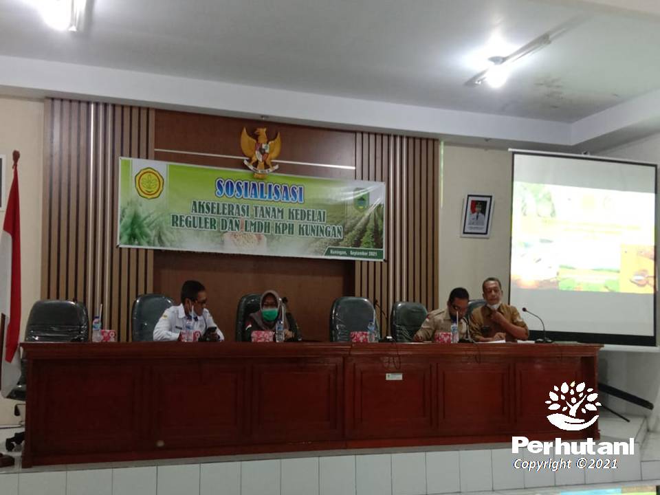 KUNINGAN, PERHUTANI (22/9/2021) | Dalam rangka evaluasi percepatan dan pemantapan pelaksanaan kegiatan utama Kementerian Pertanian Tahun 2021, Perhutani Kesatuan Pemangkuan Hutan (KPH) Kuningan mengadakan pertemuan terkait tanaman  kedelai  bersama Dinas Ketahanan Pangan dan Pertanian, bertempat di Aula Kantor Dinas Ketahanan Pangan dan Pertanian Kabupaten Kuningan, Selasa (21/9).