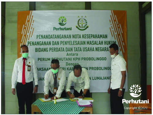 PROBOLINGGO, PERHUTANI (9/4/2021) | Perhutani Kesatuan Pemangkuan Hutan (KPH) Probolinggo bersama Kejaksaan Negeri (Kejari) Kabupaten Probolinggo dan Kejari Kabupaten Lumajang melakukan penandatanganan Memorandum Of Understanding (MoU) tentang penanganan dan penyelesaian masalah hukum bidang perdata dan Tata Usaha Negara di Kantor Bagian Kesatuan Pemangkuan Hutan (BKPH) Sukapura, Kamis (8/4).