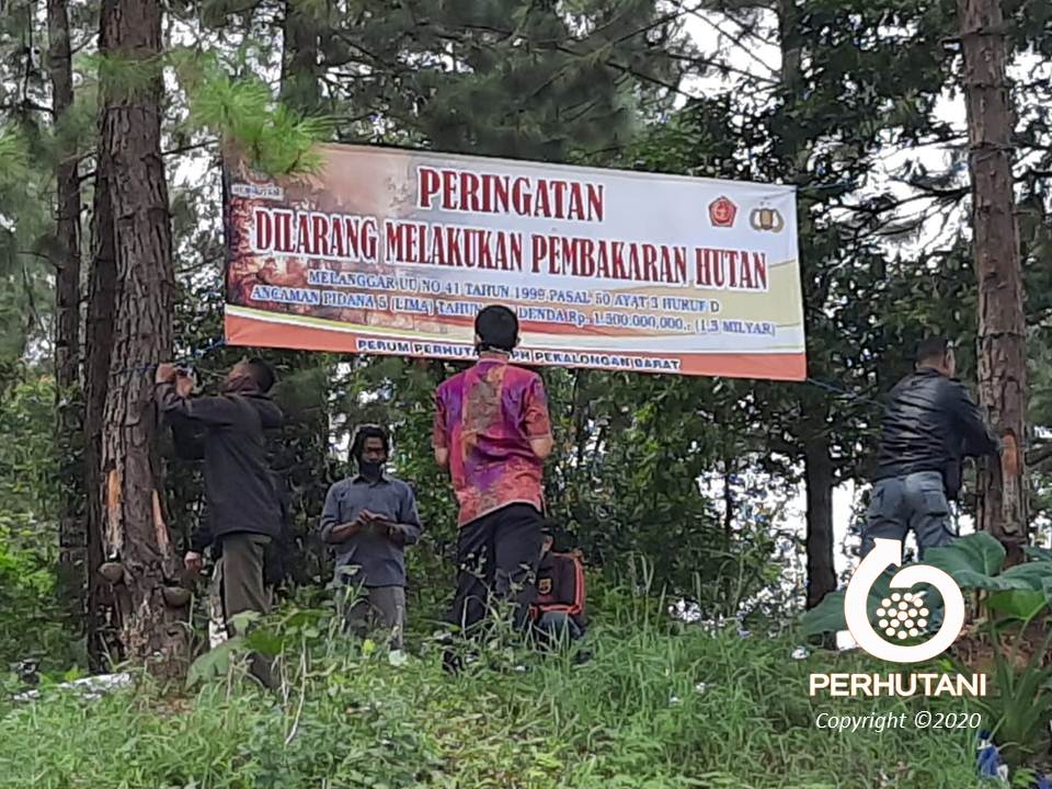 PEKALONGAN BARAT, PERHUTANI (10/07/2020) | Perhutani Kesatuan Pemangkuan Hutan (KPH) Pekalongan Barat bersama Komunitas Pecinta Alam Pekandangan (Kompak) melakukan langkah preventif pencegahan  kebakaran hutan dan lahan dengan memasang spanduk peringatan pelarangan pembakaran hutan di petak 47 RPH Guci BKPH Bumijawa, Jum’at (10/07).