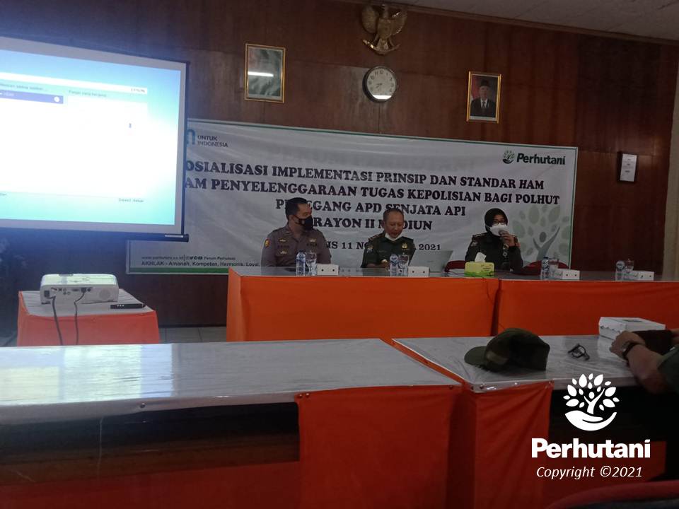SARADAN, PERHUTANI (12/11/2021) | Untuk memberikan pemahaman tentang standar Hak Asasi Manusia (HAM) kepada petugas Perhutani pemegang Alat Perlindungan Diri (APD) senjata api yakni Polhut Mobil (Polhutmob) dan Polhut Teritorial (Polter), Perhutani bersama Polres Madiun melakukan sosialisasi implementasi prinsip dan standar HAM dalam penyelenggaraan tugas Kepolisian bagi Polhutan pemegang APD senjata api di aula kantor Perhutani KPH Saradan, Kamis (11/11).