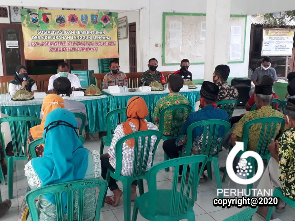 MOJOKERTO, PERHUTANI (02/07/2020) | Perhutani Kesatuan Pemangkuan Hutan (KPH) Mojokerto mendukung upaya Pemerintah Desa (Pemdes) Asemgede Kecamatan Ngusikan Kabupaten Jombang melakukan sosialisasi dan pembentukan Kampung Tangguh Semeru di Balai Desa Asemgede, Rabu (01/07).