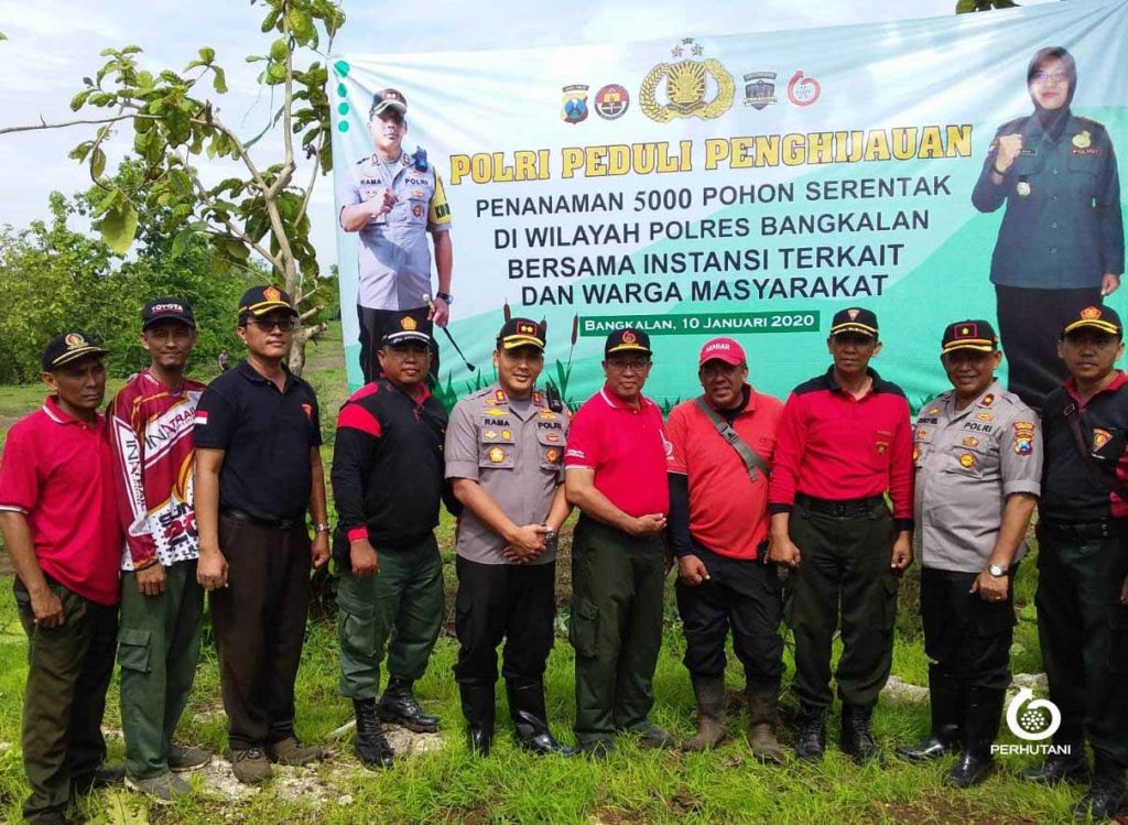 MADURA, PERHUTANI (10/01/2020) | Perhutani Kesatuan Pemangkuan Hutan (KPH) Madura mendukung program penghijauan Kepolisian Republik Indonesia (Polri) yang dilaksanakan Kepolisian Resor (Polres) Bangkalan yang melakukan penanaman yang dilaksanakan di petak 49h Resort Pemangkuan Hutan (RPH) Blega, Bagian Kesatuan Pemangkuan Hutan (BKPH) Blega, Jum’at (10/12).