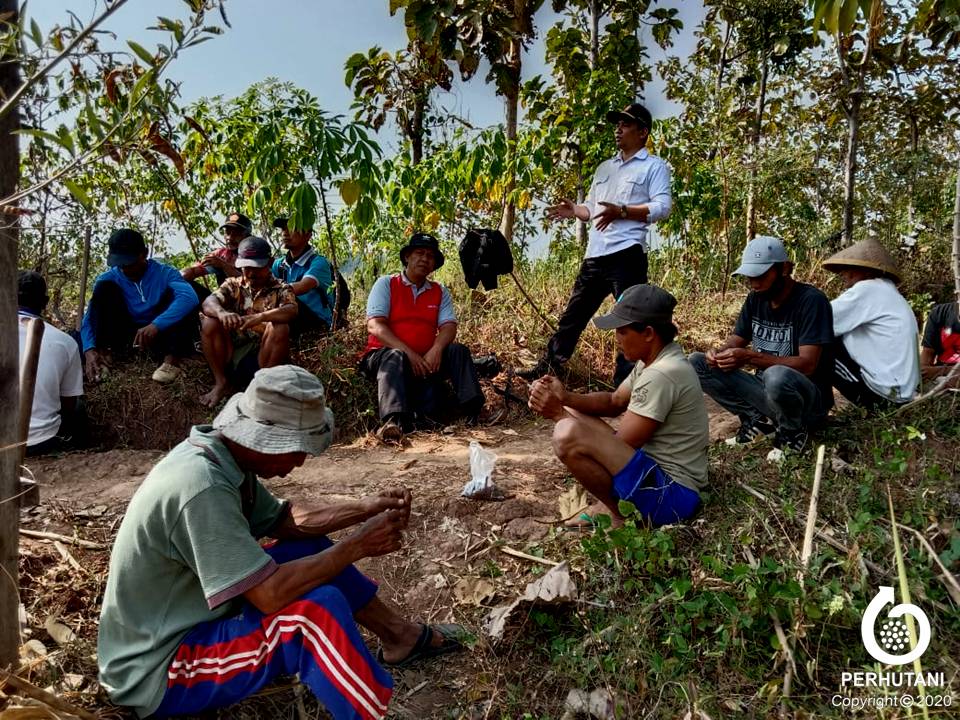 MADIUN, PERHUTANI (11/8/2020) | Untuk mengantisipasi kebakaran hutan dan lahan di wilayahnya, Perhutani Kesatuan Pemangkuan Hutan (KPH) Madiun menggandeng Lembaga Masyarakat Desa Hutan (LMDH) Wono Lestari Desa Bolo melakukan sosialisasi dalam rangka pencegahan dan pengendalian kebakaran hutan dan lahan (Dalkarhutla) bertempat di petak 20b Resort Pemangkuan Hutan (RPH) Kresek Bagian Kesatuan Pemangkuan Hutan (BKPH) Brumbun, Senin (10/8).