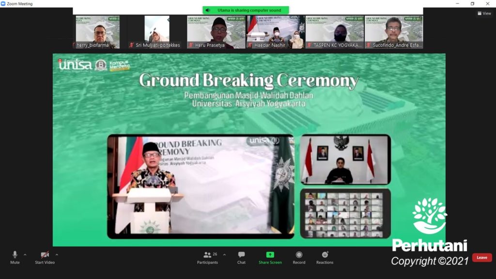 JAKARTA, PERHUTANI (14/08/2021) | Universitas Aisyiyah Yogyakarta lakukan acara Ground Breaking Pembangunan Masjid Walidah Dahlan yang dilaksanakan secara daring bersama dengan seluruh BUMN di Indonesia, Sabtu (14/08).