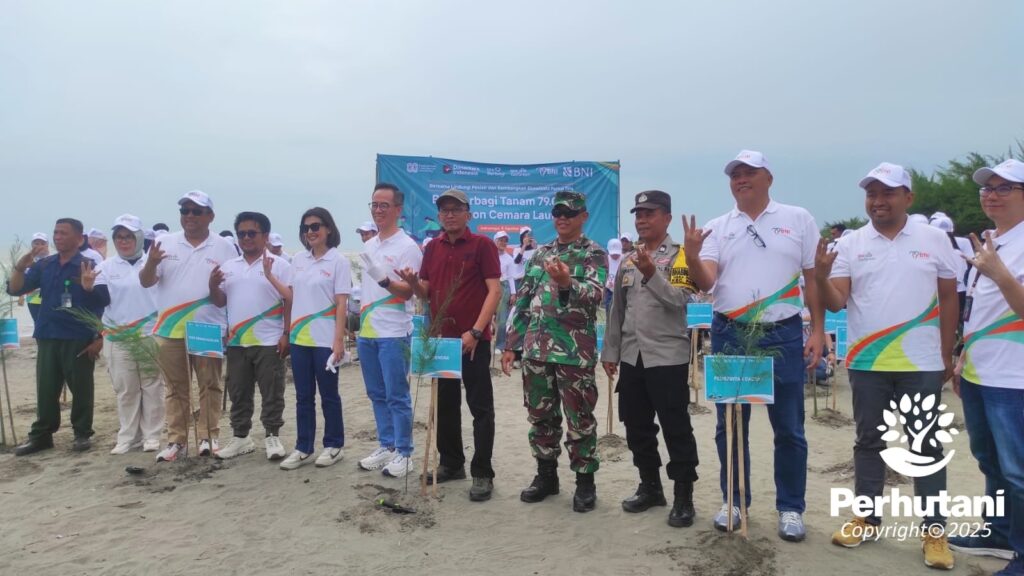 INDRAMAYU, PERHUTANI (11/08/2025)  | Dalam rangka mendukung pelestarian lingkungan pesisir serta upaya mitigasi abrasi pantai, Perhutani Kesatuan Pemangkuan Hutan (KPH) Indramayu bersama Yayasan Rumah Madani menggelar kegiatan penanaman pohon Cemara Laut di lokasi Wisata Alam Pantai Tiris, Petak 69 dan 70, Resort Pemangkuan Hutan (RPH) Pabeanilir, Bagian Kesatuan Pemangkuan Hutan (BKPH) Indramayu, pada Sabtu (09/08).
