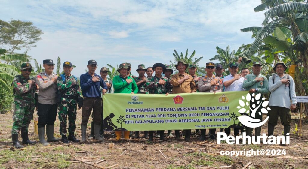 BALAPULANG, PERHUTANI (07/11/2024) | Perhutani Kesatuan Pemangkuan Hutan (KPH) Balapulang, dalam hal ini personel Bagian Kesatuan Pemangkuan Hutan (BKPH) Pengarasan bersama Tentara Nasional Indonesia (TNI) Komando Distrik Militer (Kodim) 0713 Brebes Komando Rayon Militer (Koramil) 09 Tonjong Kepolisian Sektor Tonjong, dan Pemerintah Desa Tonjong Kecamatan Tonjong dalam memasuki musim penghujan melaksanakan kegiatan penanaman pohon dan penanaman tanaman pangan bersama di Petak 24 A Resort Pemangkuan Hutan (RPH) Tonjong, Rabu (06/11). Pohon yang ditanam adalah tanaman pokok jati, sedangkan tanaman tumpang sari berupa tanaman jagung.