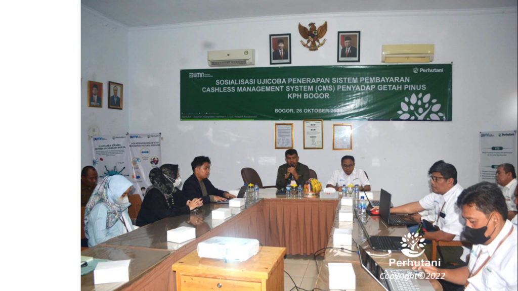 BOGOR, PERHUTANI (25/10/2022) | Perhutani Kesatuan Pemangkuan Hutan (KPH) Bogor, melaksanakan sosilisasi Pembayaran Cashless managem System (CMS) kepada para penyadap getah Pinus, bertempat di aula kantor KPH Bogor. Rabu (25/10).