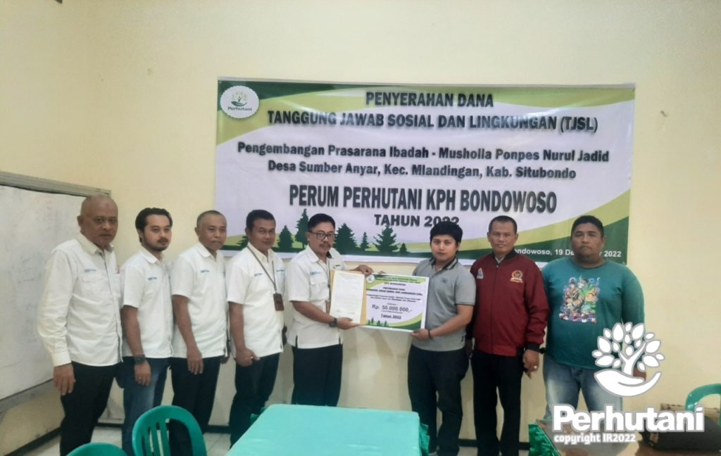 BONDOWOSO, PERHUTANI (19/12/2022) | Perum Perhutani Kesatuan Pemangkuan Hutan (KPH) Bondowoso menyerahkan bantuan dana Tanggung Jawab Sosial dan Lingkungan (TJSL) tahun buku 2022 senilai Rp. 50 juta secara simbolis, kepada Panitia Pembangunan dan Renovasi Sarana dan Prasarana Ibadah Pondok Pesantren Nurul Jadid, Desa Sumberanyar, Kecamatan Mlandingan, Kabupaten Situbondo, Senin (19/12).