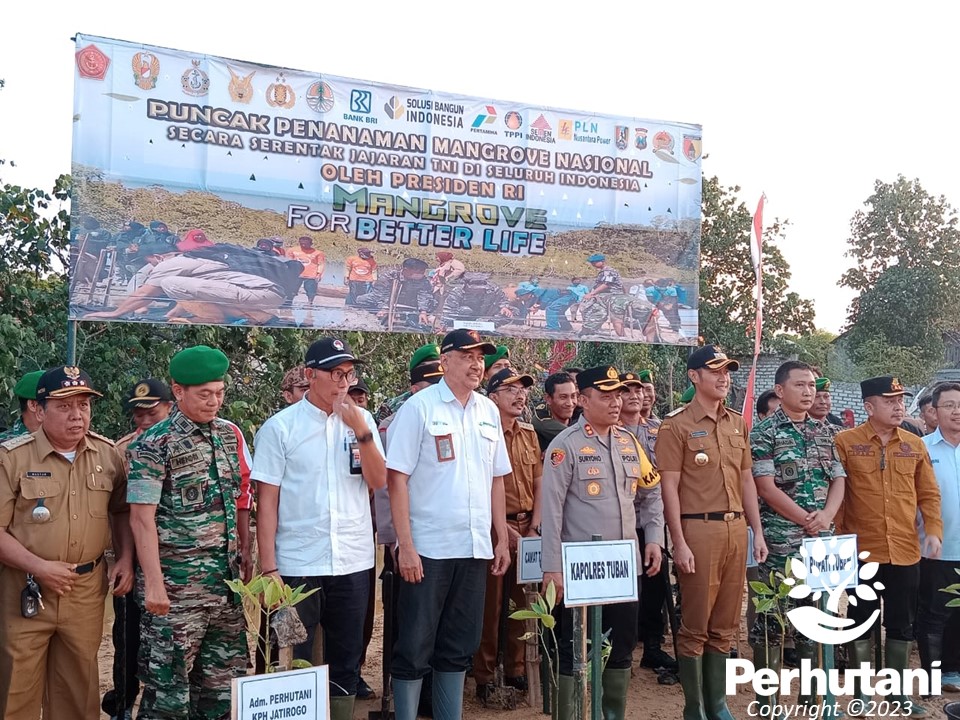 JATIROGO, PERHUTANI (16/05/23) | Perhutani Kesatuan Pemangkuan Hutan (KPH) Jatirogo turut serta meramaikan kegiatan puncak penanaman mangrove secara nasional yang dilakukan serentak bersama jajaran TNI di seluruh Indonesia, khusus di wilayah kerja Perhutani Jatirogo difokuskan pada wilayah Pantai Gadon bersama Kodim 0811 Tuban yang termasuk wilayah administratif Desa Gadon, Kecamatan Tambakboyo, Kabupaten Tuban, Senin (15/05).