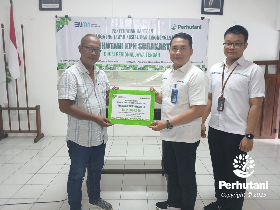 SURAKARTA, PERHUTANI (26/02/2025) | Perum Perhutani Kesatuan Pemangkuan Hutan (KPH) Surakarta menyerahkan dana bantuan Tanggung Jawab Sosial dan Lingkungan (TJSL) senilai Rp25.000.000 guna Pembangunan Musala Al-Ikhlas Dukuh Kabo Kabupaten Klaten, tepatnya satu kilometer dari objek wisata Rawa Jombor di Kantor Perhutani KPH Surakarta, Rabu (26/02).