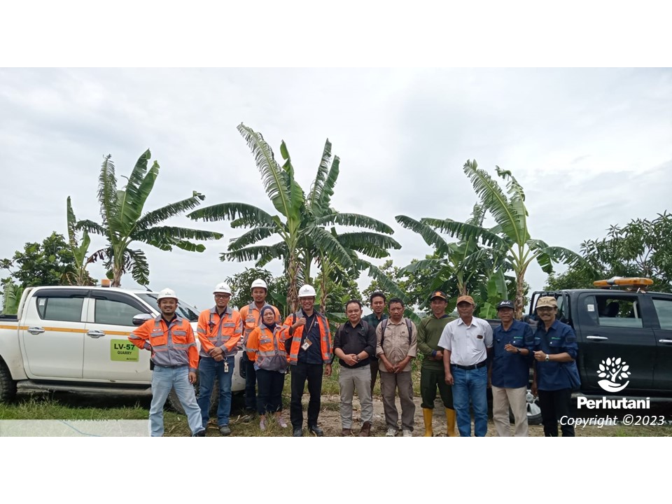 TUBAN, PERHUTANI (10/05/2023) | Perum Perhutani Kesatuan Pemangkuan Hutan (KPH) Tuban bersama jajaran Departemen Perencanaan dan Pengembangan Bisnis Divisi Regional (Divre) Jawa Timur melakukan tinjaun lapangan bersama PT Solusi Bangun Indonesia (SBI) Tbk., dalam rangka kerjasama pemanfaatan alur jalan guna kelancaran angkutan bahan baku material clay (tanah liat) di Petak 10C-1 Resort Pemangkuan Hutan (RPH) Gaji, wilayah Bagian Kesatuan Pemangkuan Hutan (BKPH) Kerek seluas 0,10 hektar, Tuban, Selasa (10/05).