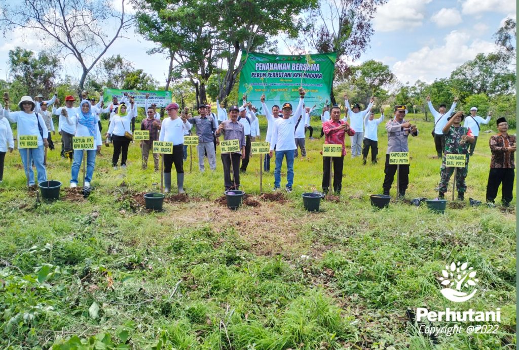 MADURA, PERHUTANI (08/12/2022) | Perhutani Kesatuan Pemangkuan Hutan (KPH) Madura menggelar aksi penanaman bersama dengan lembaga terkait, baik dari organisasi kemasyarakatan maupun pemerintah dalam rangka menghijaukan kembali hutan untuk ketahanan alam, tidak kurang 500 plances jenis kayu putih telah ditanam di petak 39c wilayah Resort Pemangkuan Hutan (RPH) Dungkek, Bagian Kesatuan Pemangkuan Hutan (BKPH) Madura Timur, Kamis (08/12).